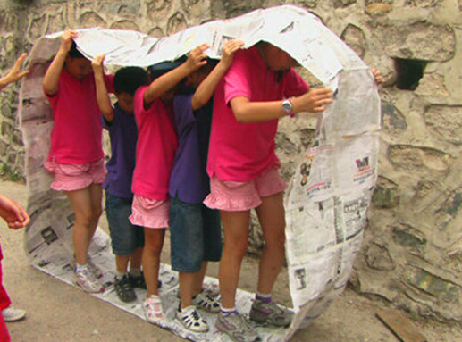 五、游戏玩法:12-15人一组利用报纸和胶带制作一个可以容纳全体团队成员的封闭式大圆环,将圆环立起来全队成员站到圆环上边走边滚动大圆环。