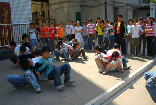 1、要求四个人一组,围成一圈,背对背的坐在地上;