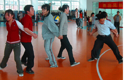 五、竞赛规则:每组2人,背夹一圆球,步调一致向前走,绕过转折点回到起点,下一组开始前进。向前走时,双手不能碰到球,否则一次罚2秒;球掉后从起点重新开始游戏。最先完成者胜出。按时间记名次,按名次计分。