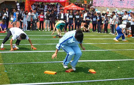 五、竞赛方法:赛道两头各一组,每组分三人自由组合,起点组手持四块“小地毯”,由第一名队员向前搭放“小地毯”,第三个队员不断地把身后的“小地毯”传给第一个队员,三人踩着“小地毯”前进30米,其距离为30米(以一篮球场宽为准,来回),要求脚不能触地,绕过障碍物回到起点,待三人全部过界后另一组将接过“地毯”以同样的方式往回走,最先到达起点的为胜。按时间记名次,按名次记分。